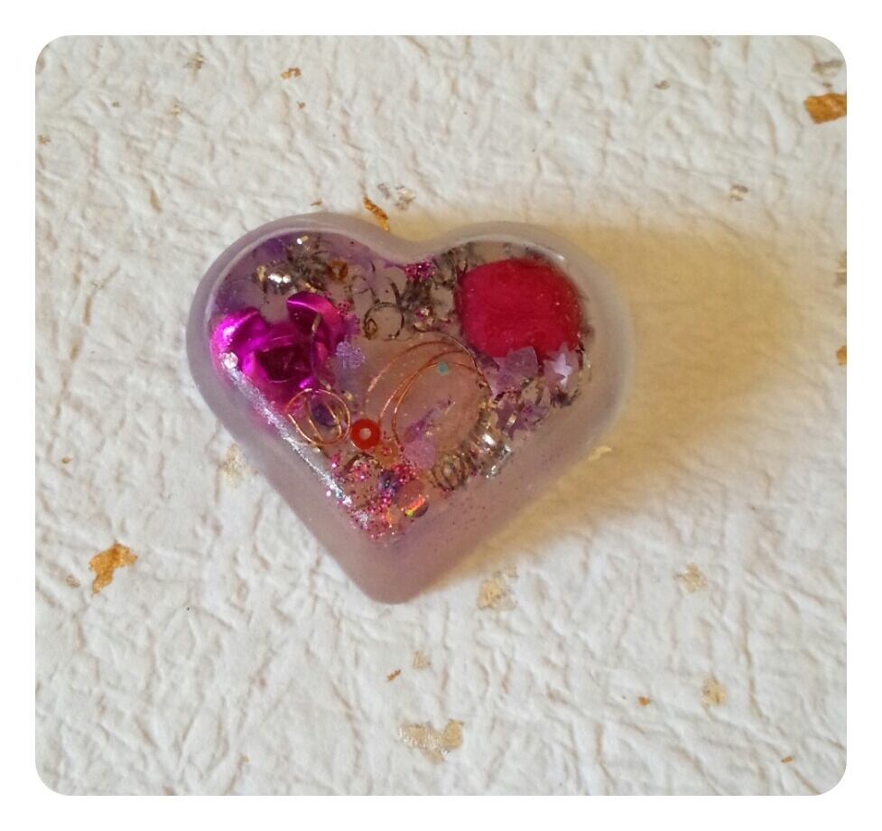 薄紫色でおしゃれな雰囲気のオルゴナイト。マゼンダ色の薔薇に似合うマゼンダ色の石が埋め込んであります。水晶・ビーズ入り・紫シルバーの星とハートもキラキラしてます。幅4.5㎝高1.5㎝