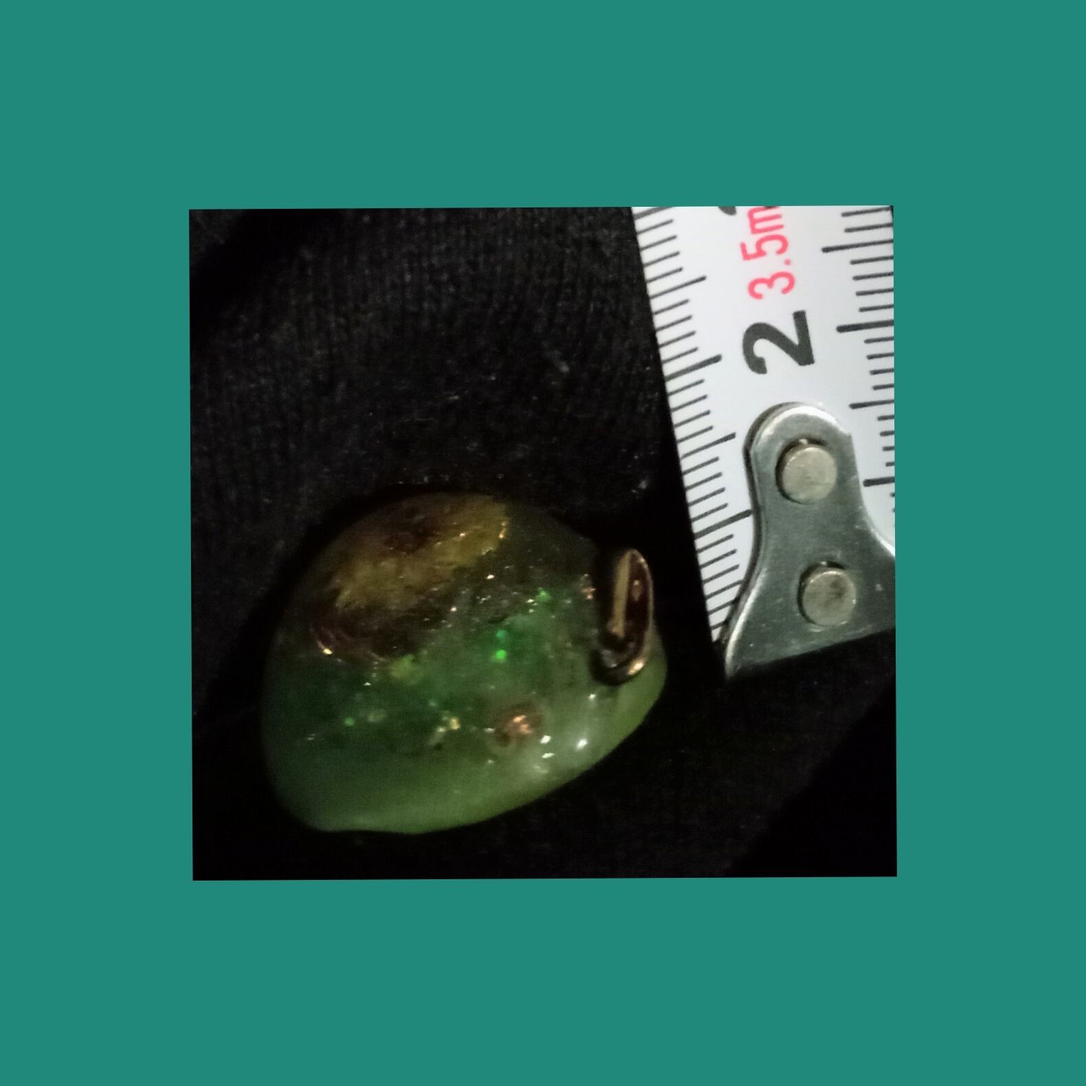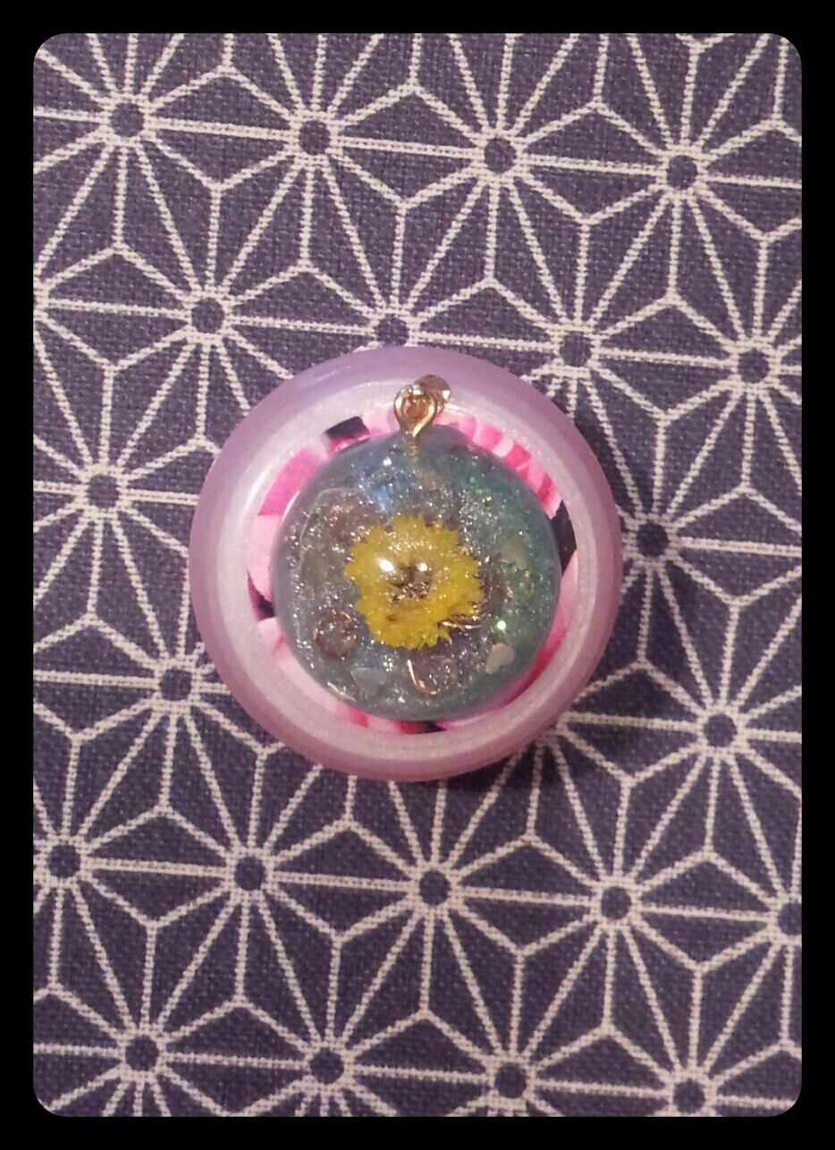 細かいラメの淡いペパーミントグリーンの中にたんぽぽが浮かんだようなペンダントトップ。